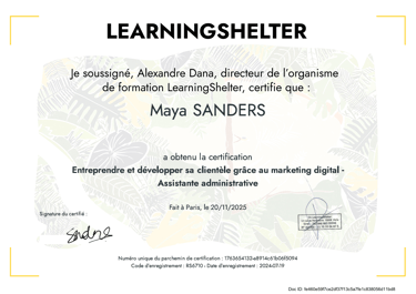 Méticuleuse, réfléchie, et extrêmement impliquée dans tout se qu'elle entreprend, elle saura mener à bien son nouveau projet. Je ne peux que la recommander sans réserve."